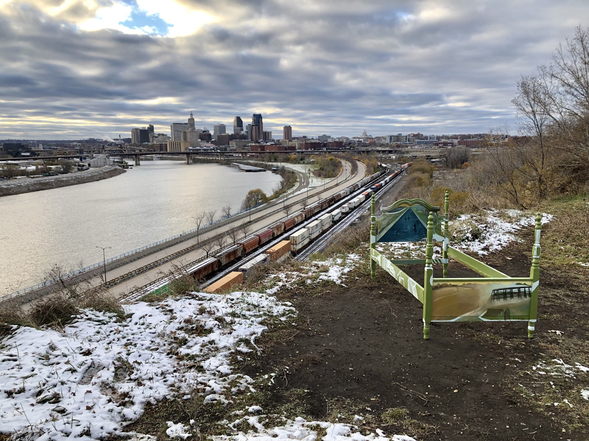 Land Revisits is an onging site-based installation of a found bed frame painted with personal dream imagery and installed multiple times at Bruce Vento Nature Sanctuary and Mounds Park. The sites lie above and below ancient sandstone cliffs, rail yards and the U-shaped bend of the river near my stomping grounds. The project incorporates soaring views above downtown St. Paul and the Mississippi, and next to Wakan Tipi sacred springs at a Dakota site in process of regeneration, led by the efforts of Phalen Creek Project.